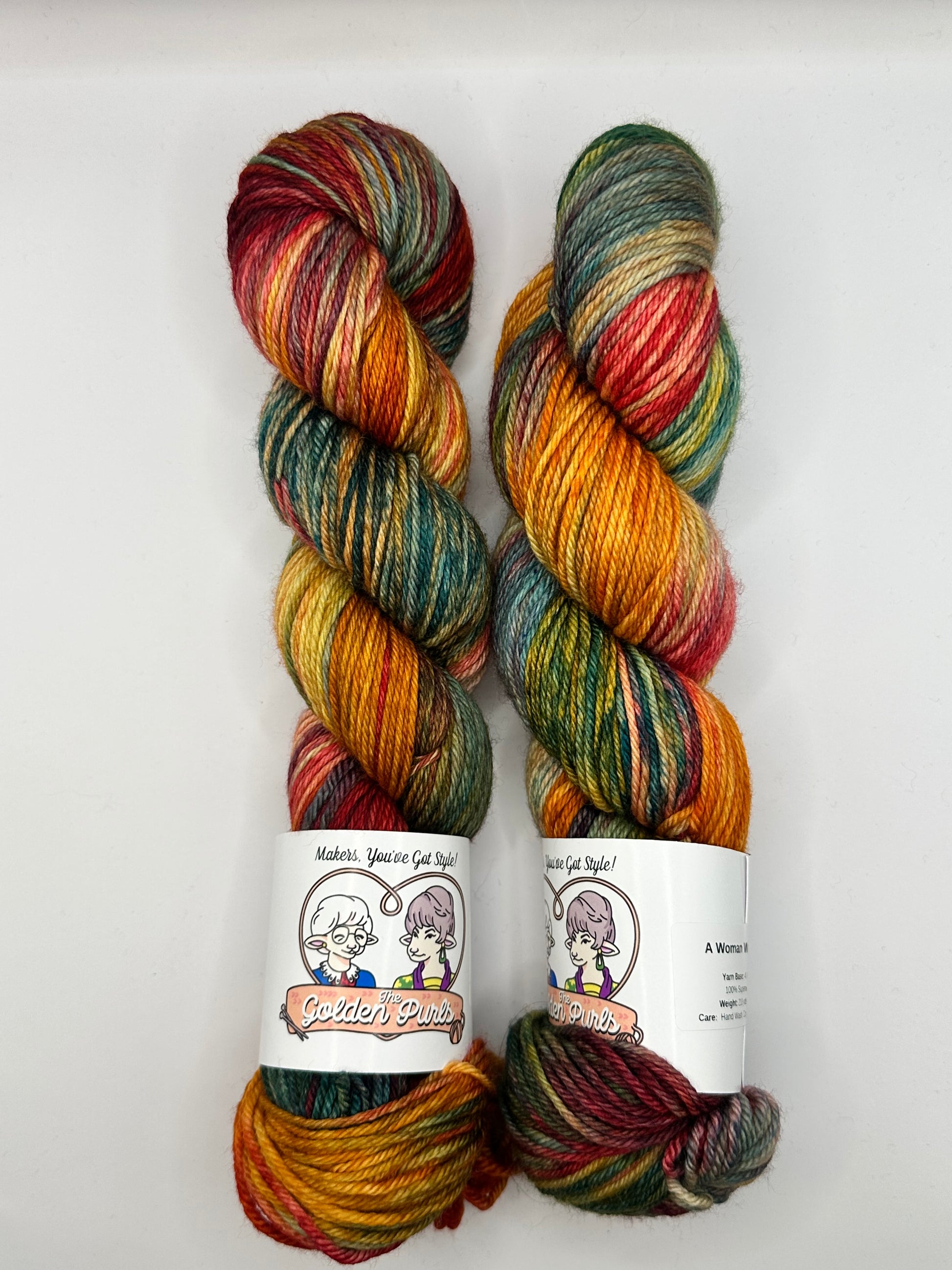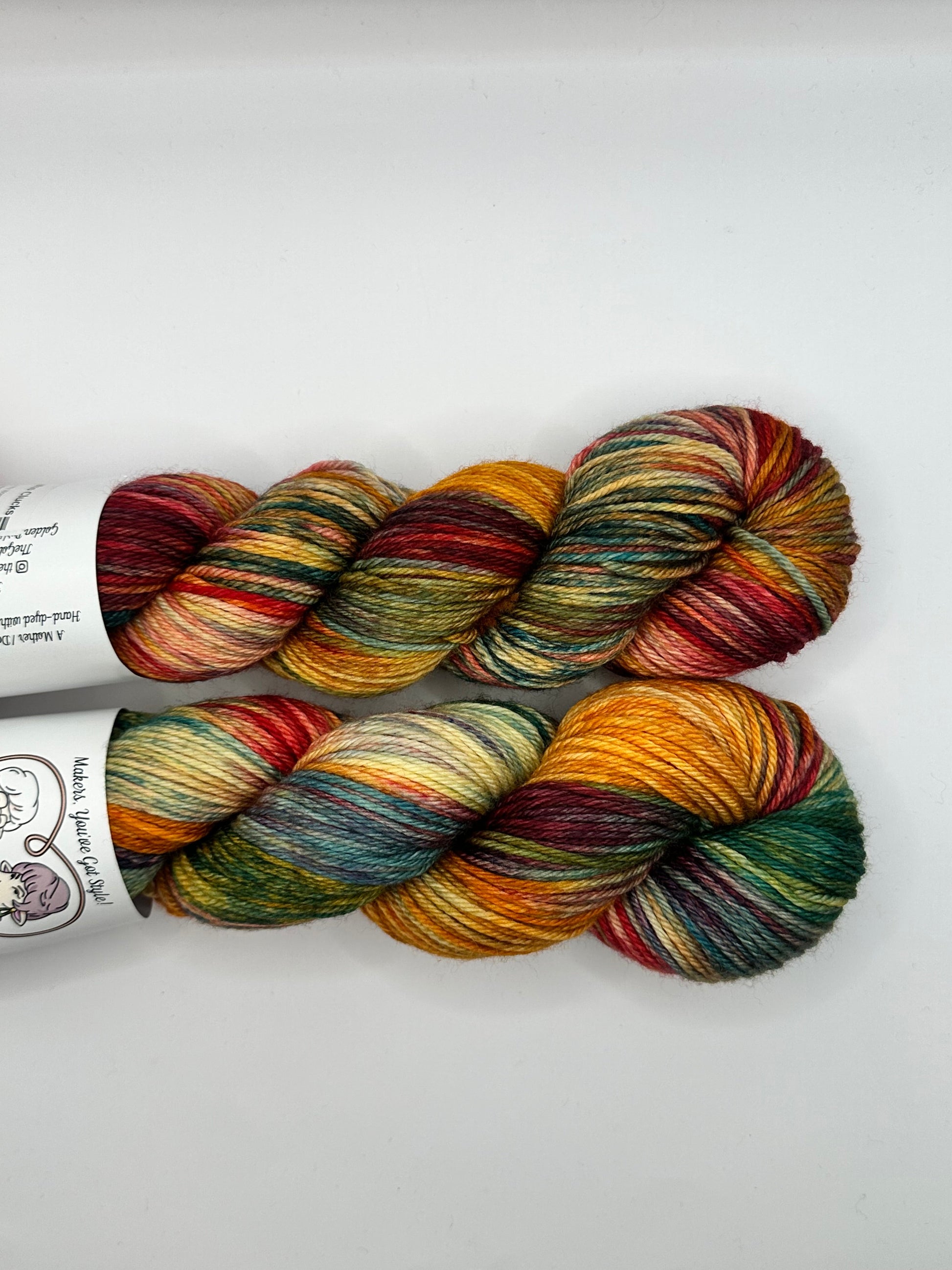 A variegated rich yarn with earth tones of red, teal, peach, oranges, and sunflower yellow inspired by Henny Penny’s get-up in the girls’ outstanding production.