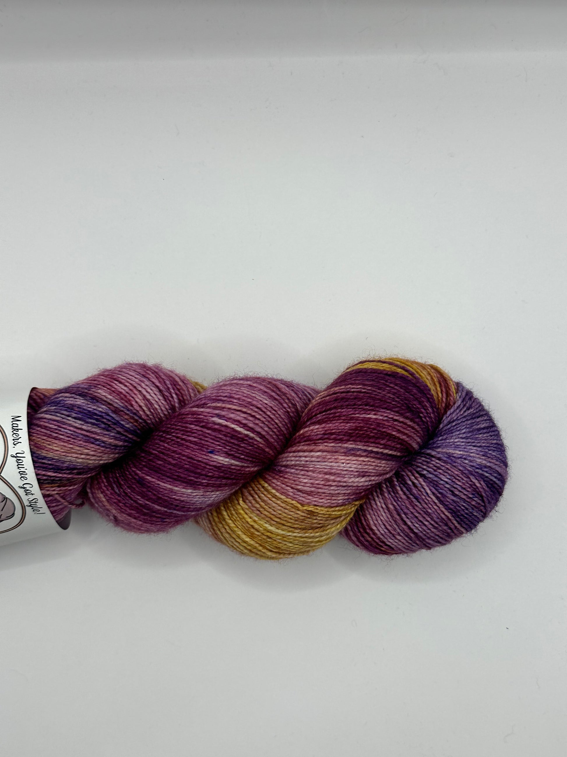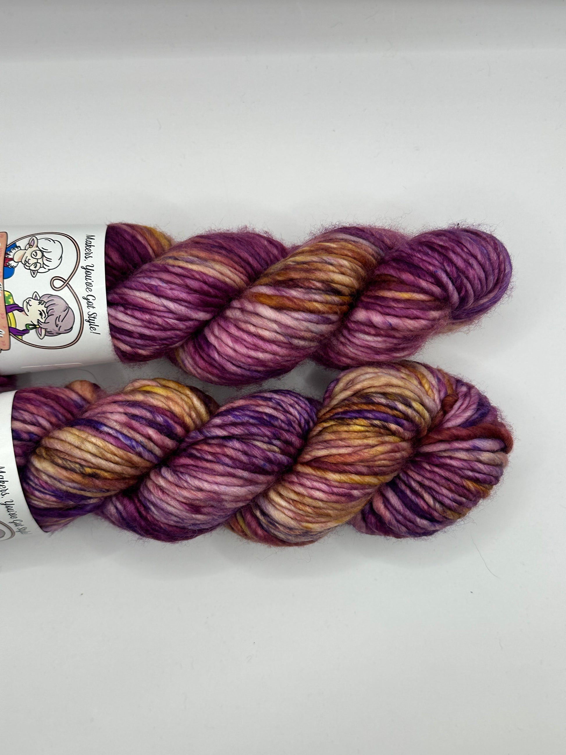 A variegated yarn with royal purple, fuchsia, and gold inspired by one of Blanche's more fabulous hobbies."